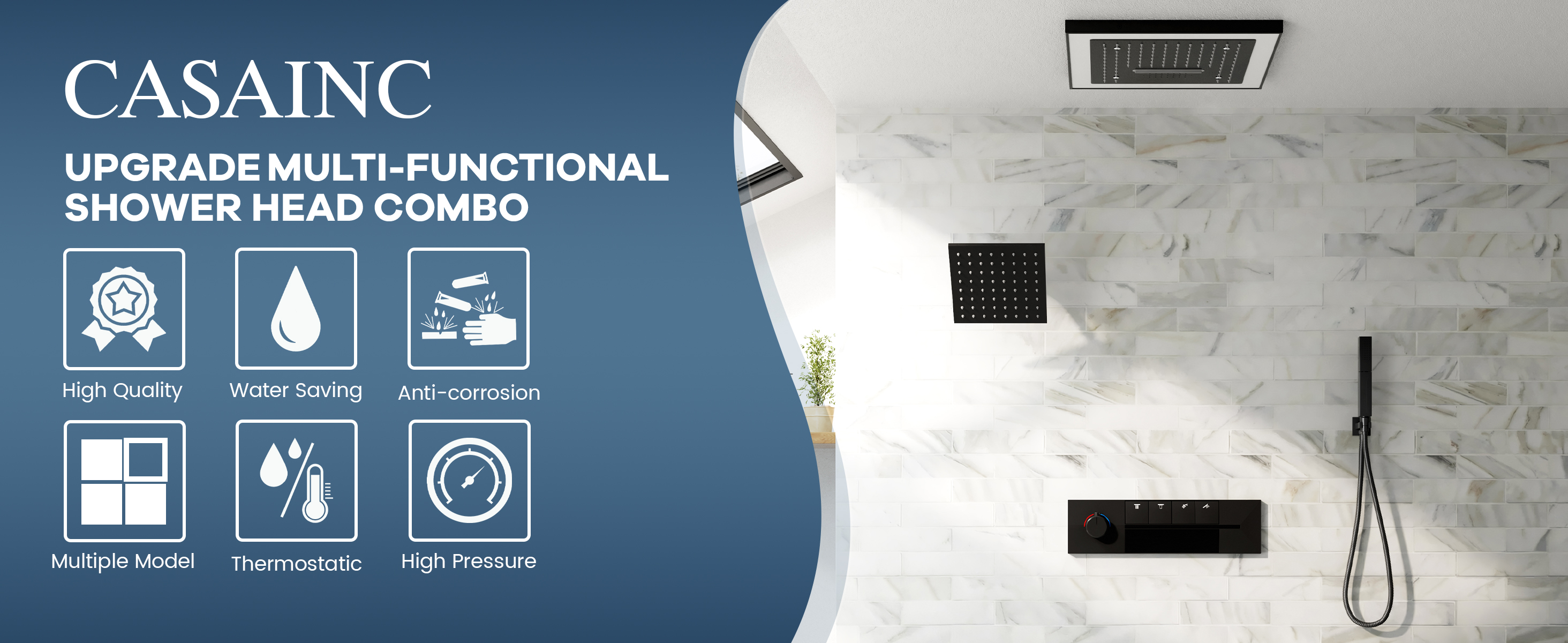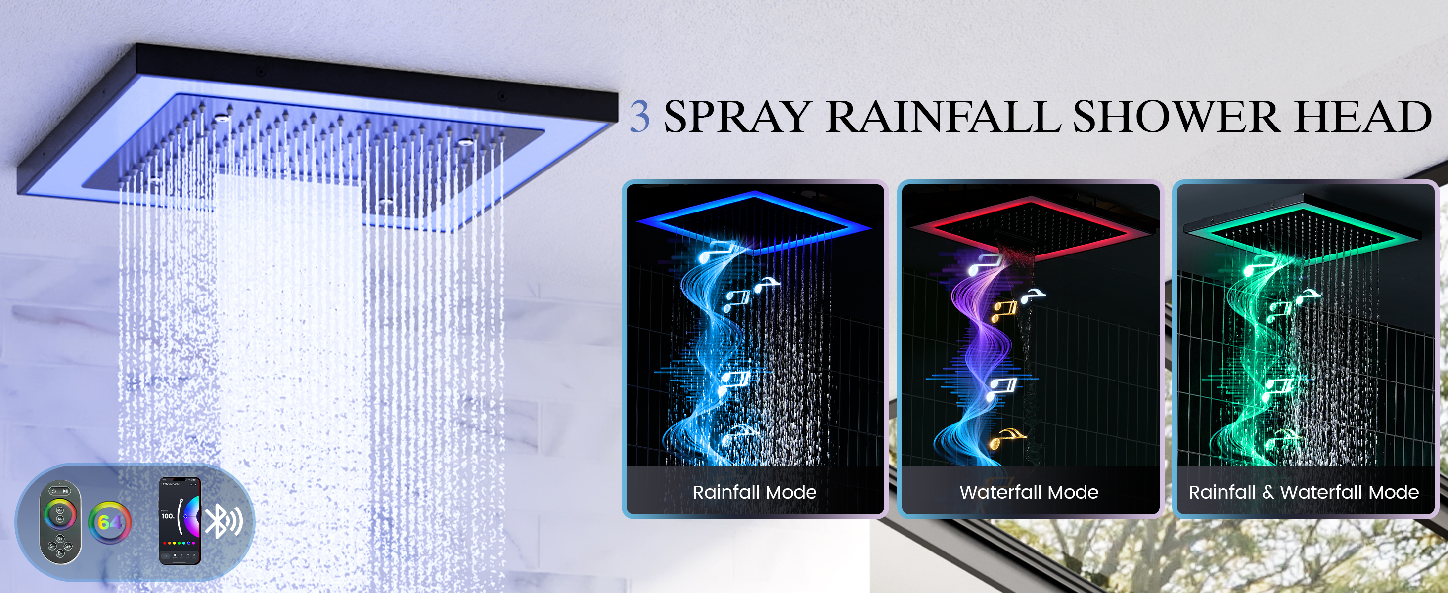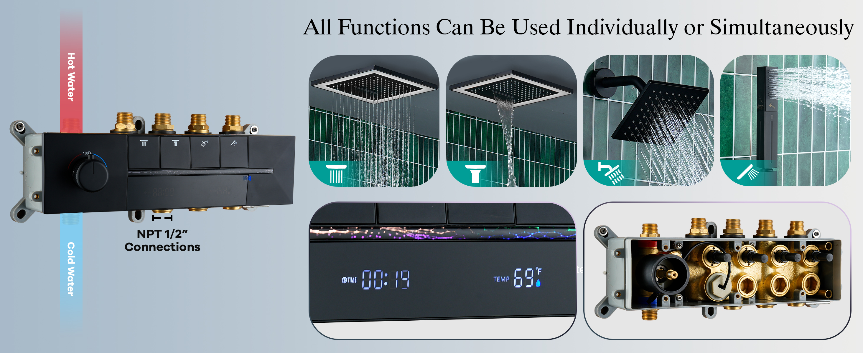 Indulge in a next-level shower experience with this luxury digital thermostatic shower system, designed to combine smart technology, immersive lighting, and refined performance. The 4-function digital thermostatic valve displays real-time temperature in Fahrenheit and allows smooth flow adjustment for consistent, personalized comfort. The LED ceiling showerhead offers both rainfall and waterfall modes, enhanced by 64-color ambient perimeter lighting that can be controlled via a mobile app or remote. Paired with a solid brass dual-function handheld shower and dual GPM flow options, this system transforms everyday showers into a spa-inspired retreat.