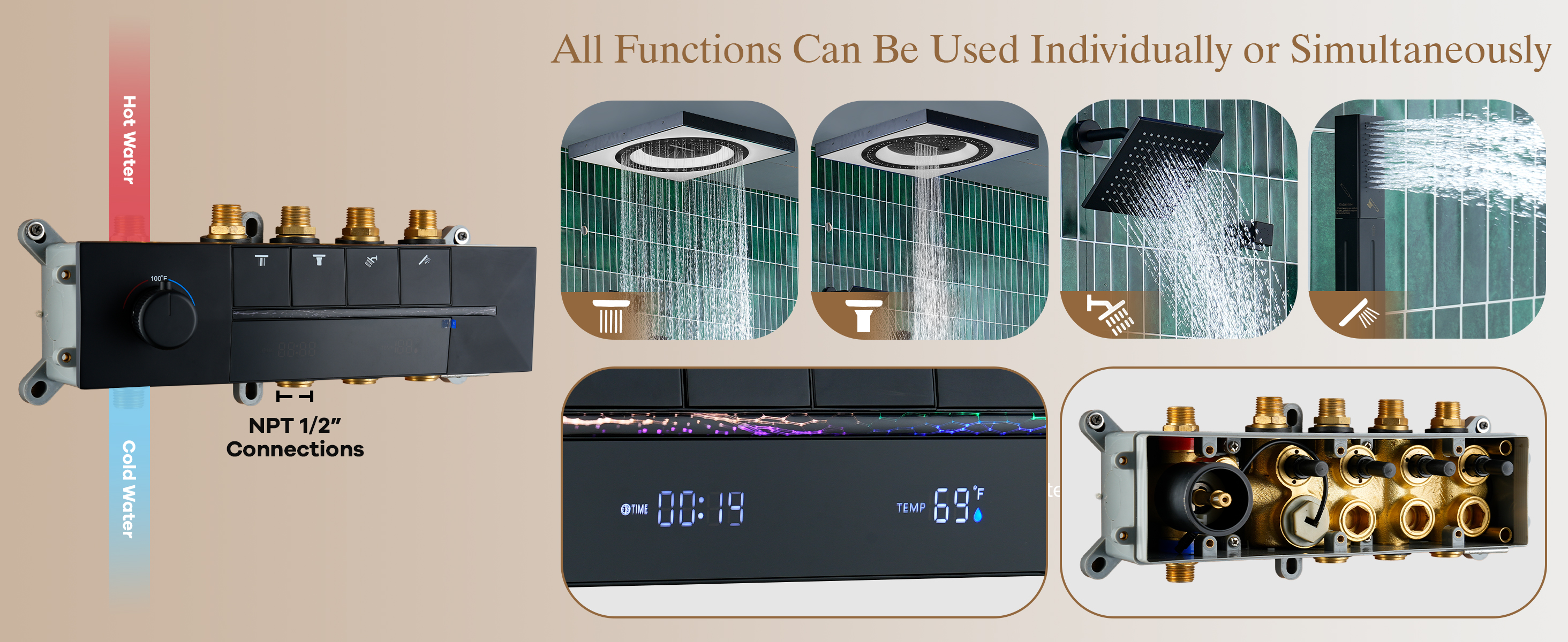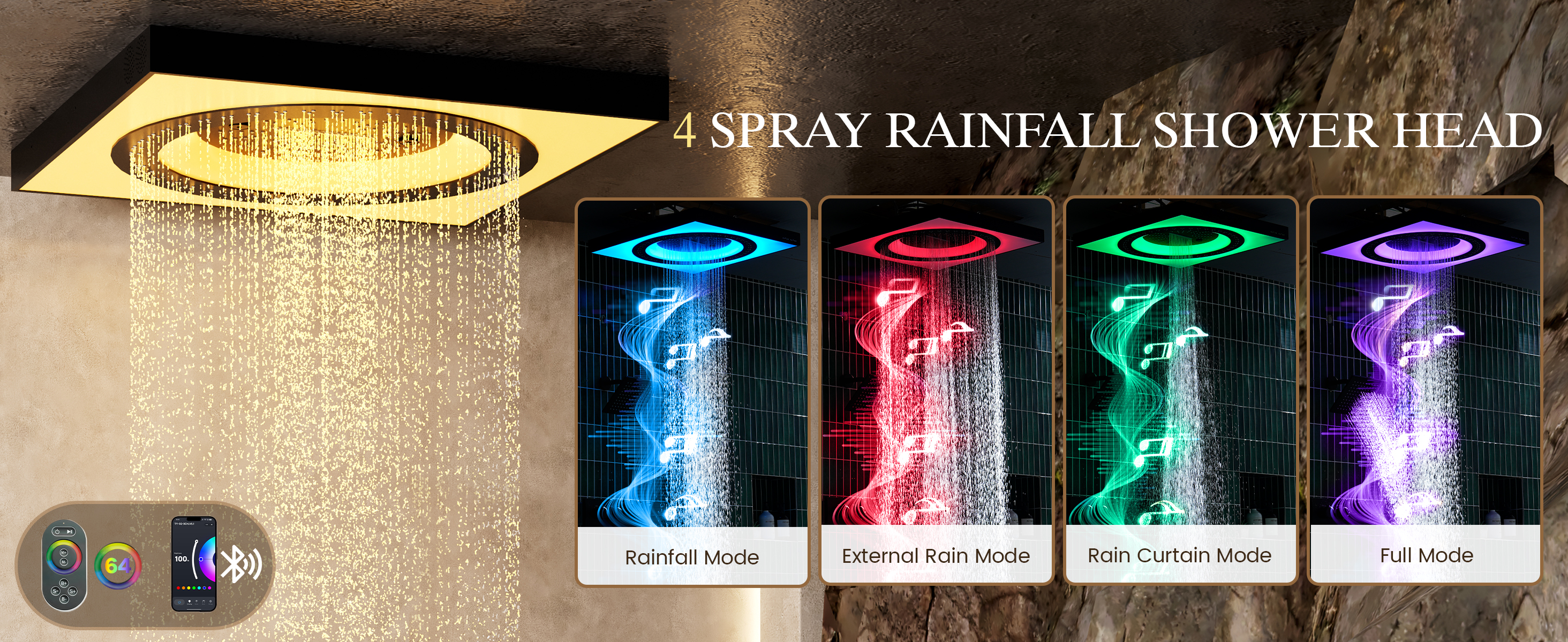 The 6-function digital thermostatic control panel displays real-time temperature in Fahrenheit and allows precise flow adjustment for consistent, personalized comfort. A striking 24’‘ LED music rain panel delivers rainfall, side rainfall, and waterfall modes with customizable 64-color ambient lighting, complemented by an additional 8-inch thick rain head for concentrated coverage. Six body jets and a solid brass multifunction handheld complete the experience, creating a full-body spa retreat enhanced by smart app and remote lighting control.